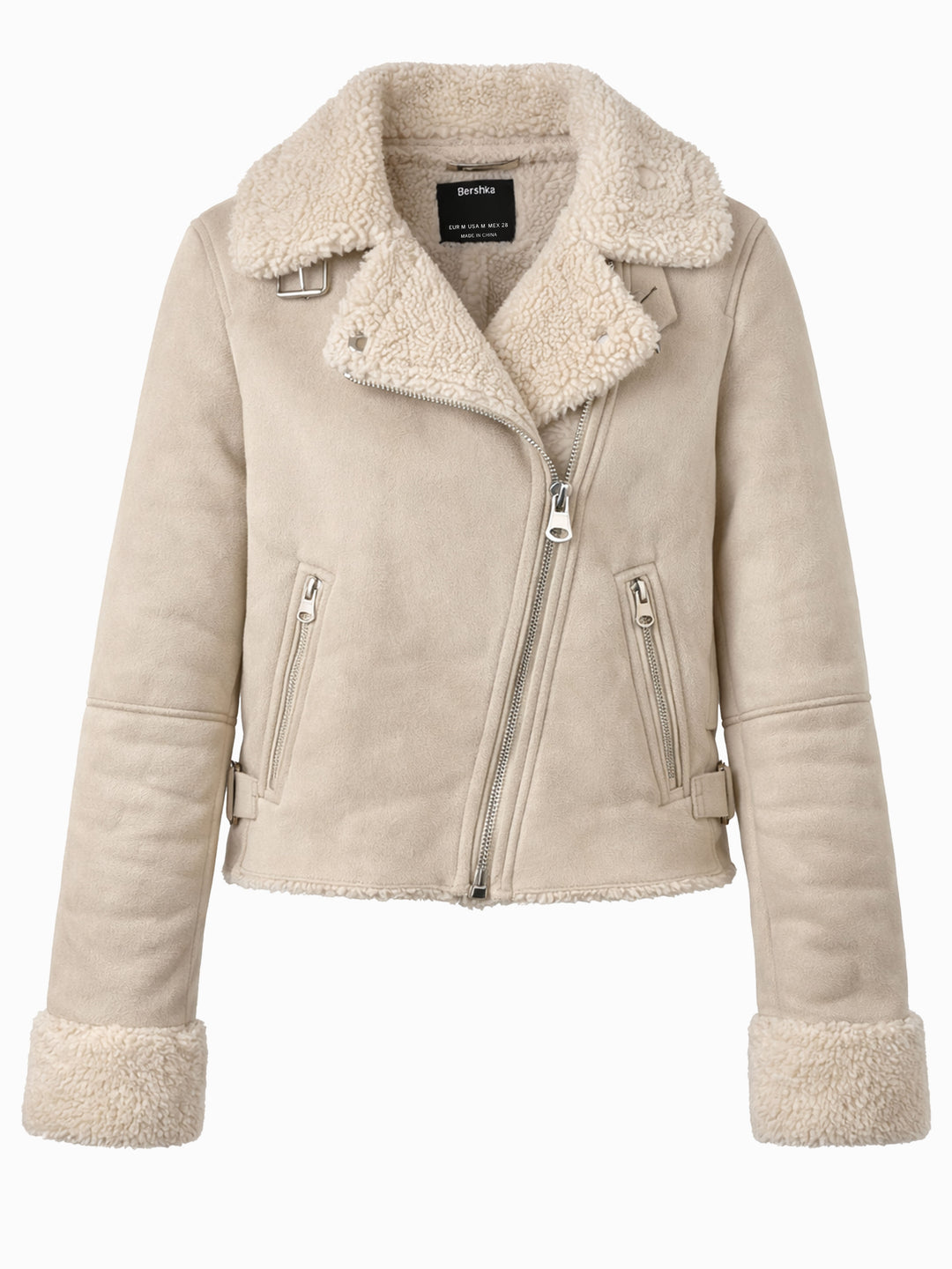 Bershka Teddyjacke Damen Gr. M Beige Creme Bikerjacke Kunstfell